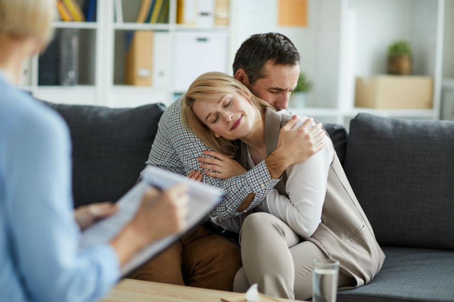 coppia si abbraccia seduta sul divano di uno psicoterapeuta